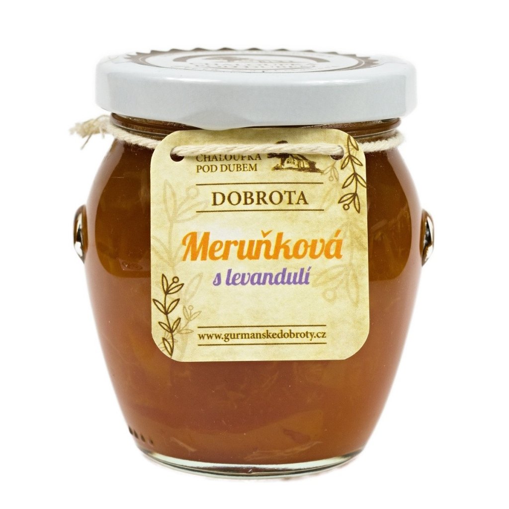 Vyzrálé meruňky pokrájené na malé kousky, pomalu vařené s kapkou ručně vymačkané citronové šťávy, vytváří perfektní základ pro úžasnou vůni levandule. Na závěr přidané rozkvetlé fialové kvítky levandule, z naší Chaloupky pod dubem, provoní každou skleničku. Typickou vůni levandule s ovocným podtónem ucítíte ihned po otevření DOBROTY.